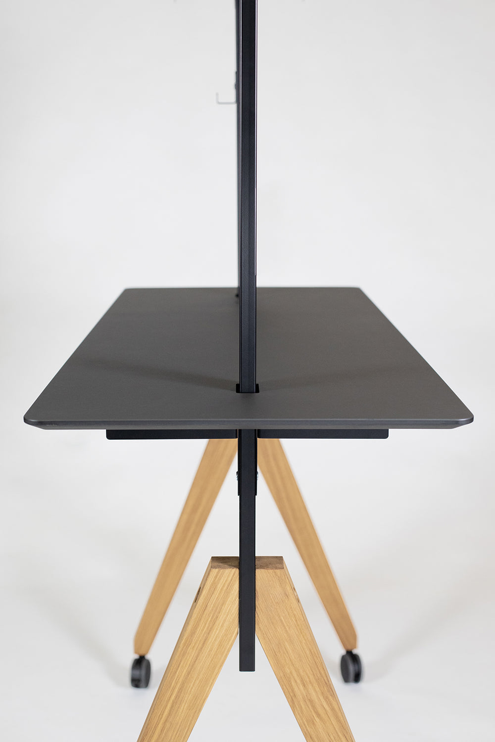 Die schlanke Arbeitsfläche hat eine Tiefe von 62 cm - genug, um den mobilen persönlichen Assistenten eine Fläche zu bieten und für eine halbe Stunde oder einen halben Tag daran seine Aufgaben zu erledigen. An Line Up kann im Stehen oder auf einem Stehhocker gearbeitet werden.