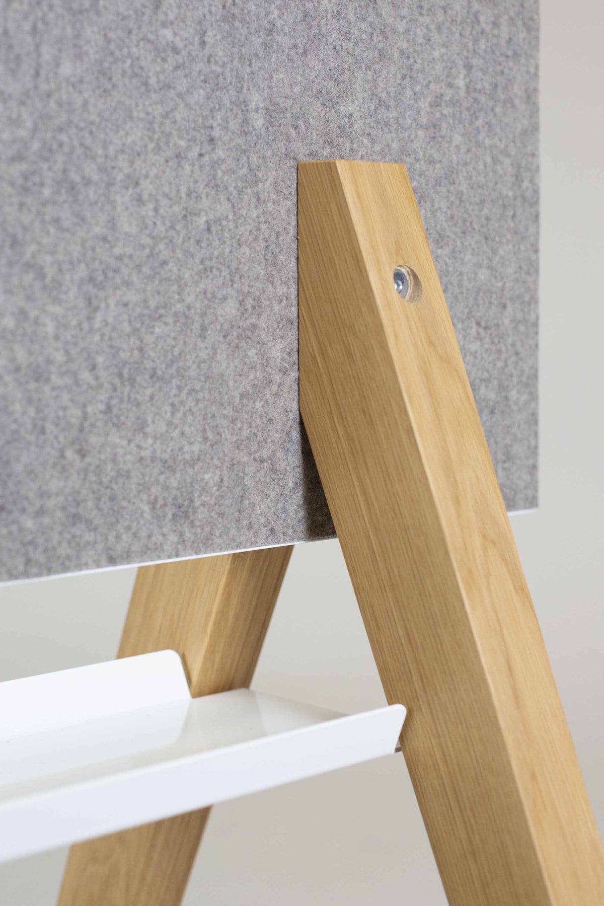 Pin Up on Tour is a successful combination of functionality and aesthetics. The pin board Pin Up on Tour is versatile in the truest sense of the word. The oiled solid wood brackets with four lockable Castors brackets ensure a firm hold. The powder-coated and magnetic metal board can be written on with Whiteboardmarkern and has a dry-wipe surface.