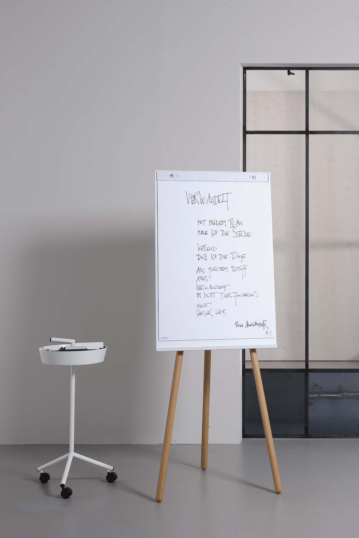 Pliable peut être utilisé comme un tableau de conférence avec n'importe quel bloc-notes standard qui est simplement accroché sur les deux broches de montage et fixé avec la barre de déchirement. Le tableau blanc peut également être utilisé comme tableau blanc inscriptible directement. L'écriture peut ensuite être essuyée à nouveau. Le tableau est en métal peint par poudrage, il est donc magnétique et, en plus du blanc et du noir, il est également disponible dans n'importe quelle couleur RAL sur demande. Les pieds pliables sont disponibles en chêne huilé ou en frêne.